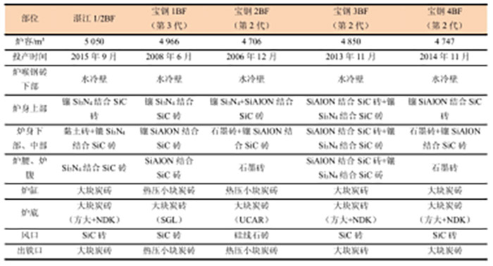高爐各部位用主要耐火材料種類,以寶鋼本部和湛江的高爐為例示于表1。