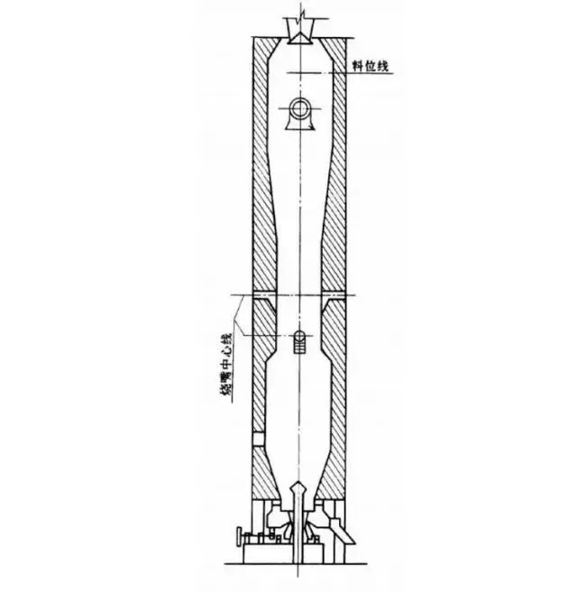 (2)鍛燒帶內徑收縮的圓筒形豎窯:為克服上述缺點,可將煅燒帶內徑略加收縮,這樣可減少物料與窯壁之間的縫隙,從而使氣體沿窯截面較為均勻分布。對使用汽化冷卻爐壁的豎窯,還可使周邊物料在下沉過程中有可能向內翻動,從而改善物料的煅燒條件,減少欠燒品。