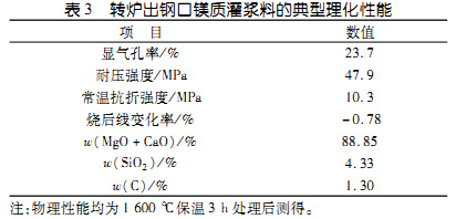 轉爐出鋼口的壽命一般為90~150爐,更換時需用鎂質灌漿料來填充其與出鋼口座磚之間的縫隙。鎂質灌漿料采用鎂砂為主要原料,以磷酸鹽為結合劑,基質中引入適量的菱鎂礦(或白云石、石灰石)細粉、氧化鉻微粉、SiO2微粉、黏土粉、低溫燒結劑和促硬劑等。鎂質灌漿料的典型理化性能見表3。