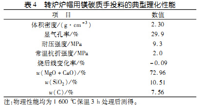 表4:轉爐爐帽用鎂碳質手投料的典型理化性能