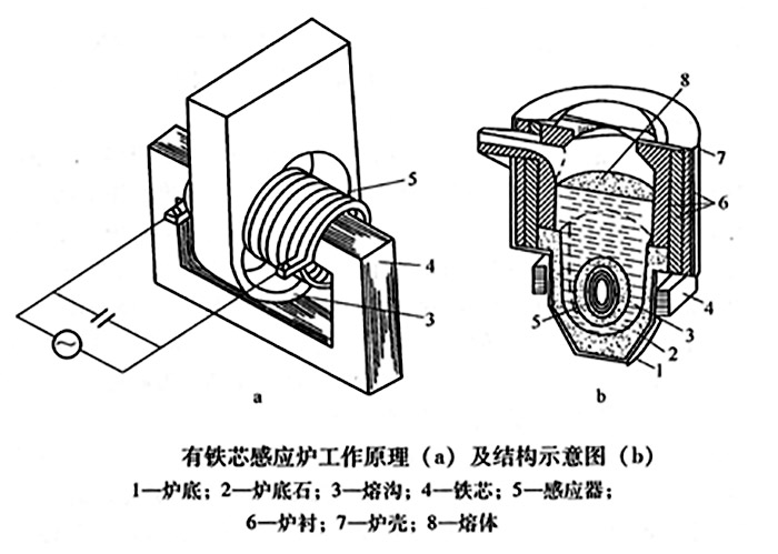 有芯爐分為上下爐體,上爐體有爐蓋、爐膛;下爐體為感應體,有熔溝等,爐子本身相當于一個帶鐵芯的變壓器,感應線圈相當于變壓器的一次線圈,熔溝中的金屬相當于變壓器的二次線圈。將工業頻率的交流電引進一次線圈時,通過電磁感應,在熔溝金屬中將產生很大的電流。在熱對流及電磁力的作用下,熔溝內熱量不斷傳遞到熔溝上部熔爐中的金屬,從而使整個熔池內的金屬熔化。因只有在熔溝閉合狀態下有芯感應爐才能正常運行,所以適于連續作業。